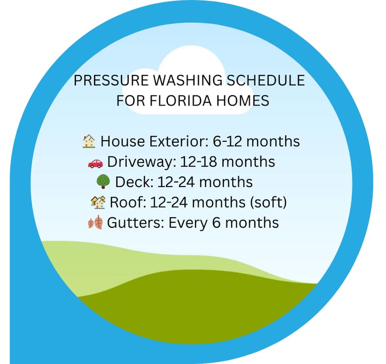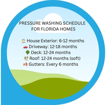 Florida's climate demands more frequent house washing than other states. Learn the ideal pressure washing schedule for your home, driveway, deck, and roof to protect your investment and maintain curb appeal.