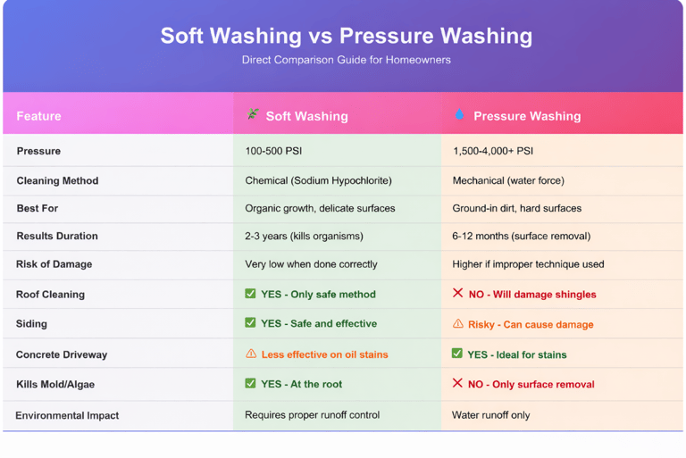 Not all exterior cleaning is the same. Learn the critical differences between soft washing and pressure washing, which method to use for each surface, and why using the wrong one could cost you thousands in damage.